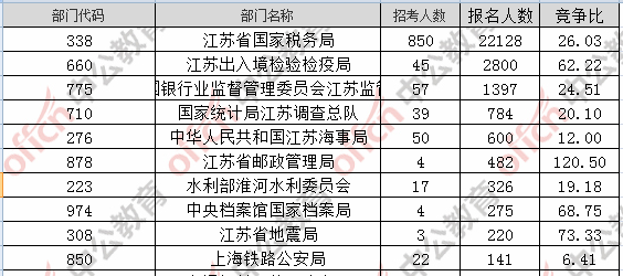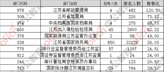 為幫助廣大考生更清晰的了解今日報名情況,江蘇中公教育整理了審核通過人數前十位的部門以及競爭比例最激烈的十大部門,供廣大考生參考: