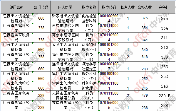 截至22日8時,競爭比例的職位為江蘇出入境檢驗檢疫局張家港出入境檢驗檢疫局食品檢驗監督科科員一職,招錄1人,截至22日8時通過人數為375人。