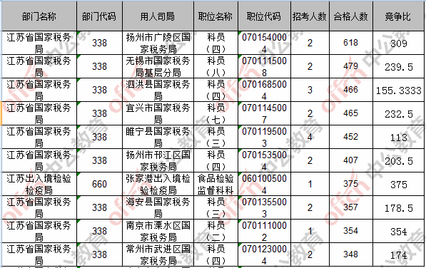 報名通過審核人數前十的職位主要集中在江蘇省國家稅務局、江蘇出入境檢驗檢疫局,具體信息如下: