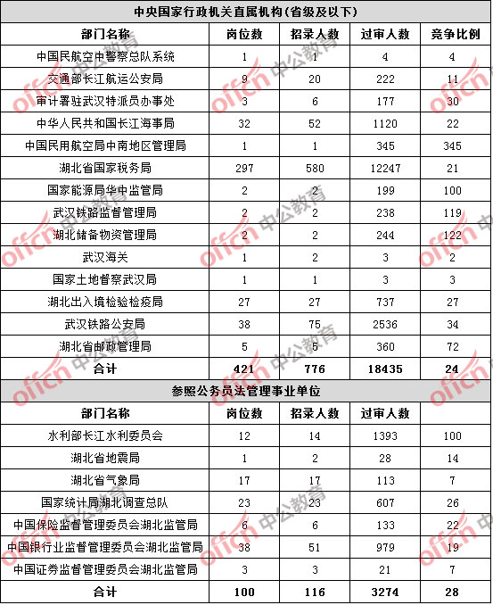 截止到22日8時,通過審核人數前三位的部門依次是:湖北省國家稅務局、武漢鐵路公安局、水利部長江水利委員會,三部門通過審核總人數達16176人,占通過審核總人數的74.51%,各部門招錄情況如下: