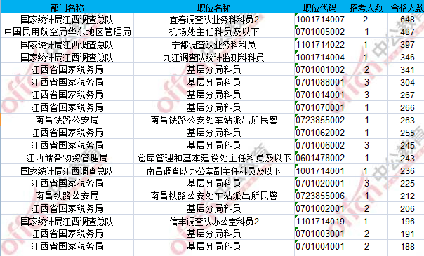 報(bào)名通過(guò)審核人數(shù)前十的職位主要集中在江西省國(guó)家稅務(wù)局、國(guó)家統(tǒng)計(jì)局江西調(diào)查總隊(duì)具體信息如下: