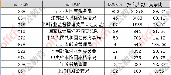 報名通過審核人數前十的職位主要集中在江蘇省國家稅務局、江蘇出入境檢驗檢疫局,具體信息如下: