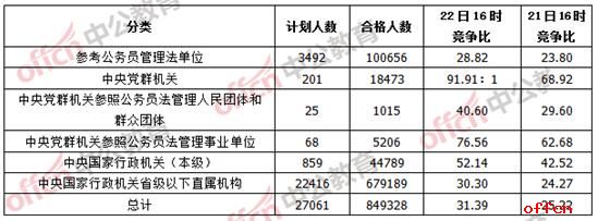 據中公教育數據統計,截至22日16時,經過了近8天的報名后,報名系統已經審核通過了849328人,超出去年同期5萬人左右,平均競爭比為31.38:1,高出去年同期的28.8:1。從單日增長量來看,較21日下午同期增加了166899人。從各系統來看,中央黨群機關競爭比,已達到91.91:1。目前仍有490個崗位報考人數還未破零,占3.14%。