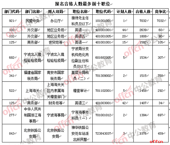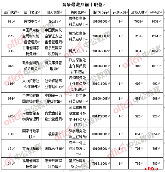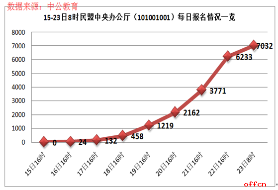 今日最熱職位仍然來自民盟中央辦公廳接待處主任科員及以下(職位代碼為101001001),該職位招錄1人,目前過審人數(shù)為7023人,競爭比高達7023:1,政委真正的“七千挑一”的職位。此職位從22日猛增了2462人之后,經(jīng)過一夜的“醞釀”,把數(shù)值悄然猛拉至7032人。此職位除要求2年基層工作經(jīng)歷、本科及以上學歷外無任何其他限制要求,在“上班族”休息的周末,報名人數(shù)的“暴漲”也在情理之中,但“上班族”的報考熱情依舊讓我們驚訝。中公網(wǎng)校專家在此提醒此類考生,目前該職位報名人數(shù)過多,錄取的幾率渺茫,希望“下手”的考生仔細斟酌,可考慮其他符合自身條件的職位報考。