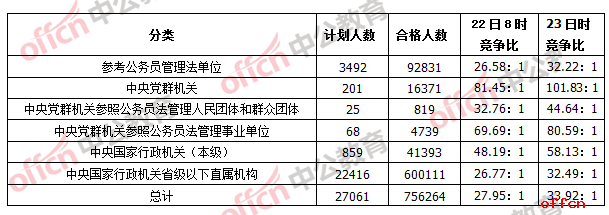10月23日,2017國家公務員考試報名進入了第九天。據中公網校數據統計,截至23日8時,經過了近8天又1夜的報名后,報名系統已經審核通過了917931人,遠超去年同期的87.2萬。較昨日同期的數據相比,報名合格人數增加了16萬余人,平均競爭比為33.92:1。民盟中央辦公廳接待處主任科員及以下(職位代碼101001001)這一職位依然最熱職位排行榜,競爭比已高達7032:1,共有21個職位競爭比1000:1。與其熱度相反的是,目前仍有438個崗位報考人數還未破零,占2%,與去年同期的308個無人報考職位多出130個。中央黨群機關參照公務員法管理人民團體和群眾團體系統、中央黨群機關參照公務員法管理事業單位這兩個系統的所有職位已經全部有人過審,報考率達100%。