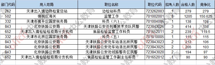 報名通過審核人數前十的職位主要集中在保稅區海關、北京鐵路公安局、天津出入境邊防檢查總站,具體信息如下: