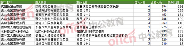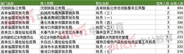 截止到23日8時,競爭比例的職位為吉林鐵路公安處線路警務區民警一職,招錄4人,截止到23日8時通過人數為894人。其次為吉林省國稅局部門。
