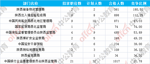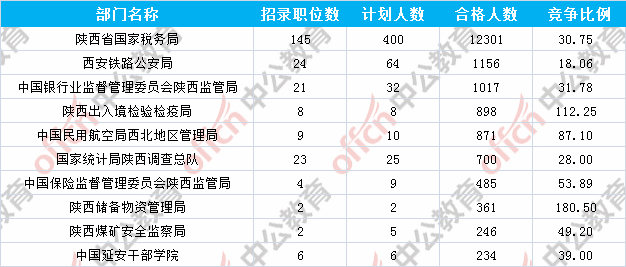 為幫助廣大考生更清晰的了解今日報名情況,陜西中公網校整理了審核通過人數前十位的部門以及競爭比例最激烈的十大部門,供廣大考生參考: