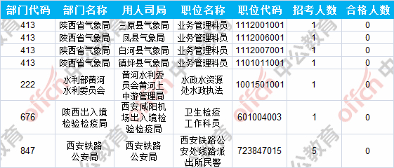 截止到23日8時,工作地點在陜西的職位共有7個無人報考,占全部職位的2.5%。下面是無人報考職位一覽表,陜西中公網校專家建議廣大考生多關注一些較冷職位,避免激烈競爭,結合自身條件,找到屬于自己的職位。