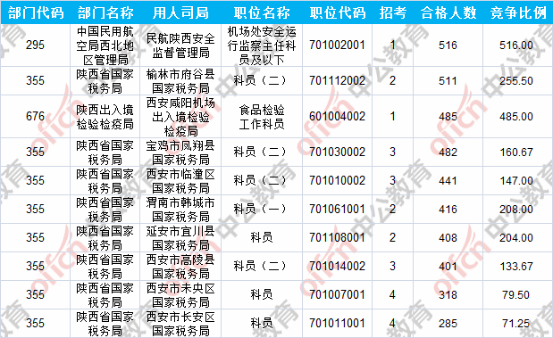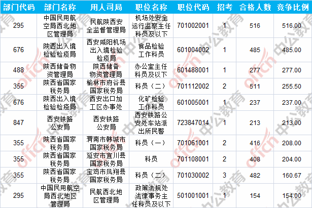報名通過審核人數前十的職位主要集中在陜西出入境檢驗檢疫局、陜西省國家稅務局、中國民用航空局西北地區管理局等部門,具體信息如下: