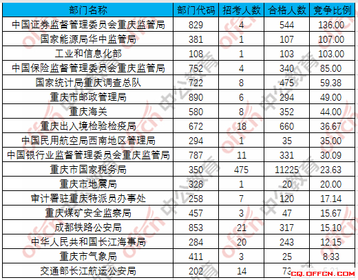 為幫助廣大考生更清晰的了解今日報名情況,重慶中公網校整理了重慶的各個部門合格人數以及競爭比例,供廣大考生參考: