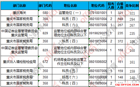 截止到23日8時,競爭比例的職位為重慶海關監管崗位(一)一職,招錄1人,截止到23日8時合格人數為321人,競爭比例為321:1。