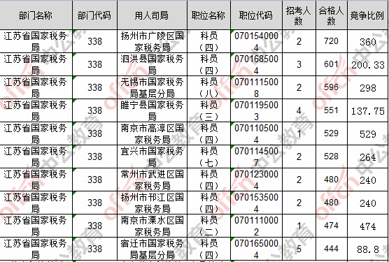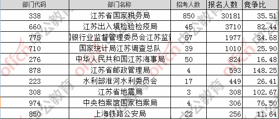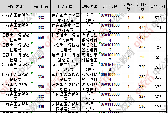報(bào)名通過審核人數(shù)前十的職位主要集中在江蘇省國家稅務(wù)局、江蘇出入境檢驗(yàn)檢疫局,具體信息如下: