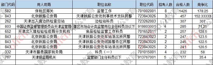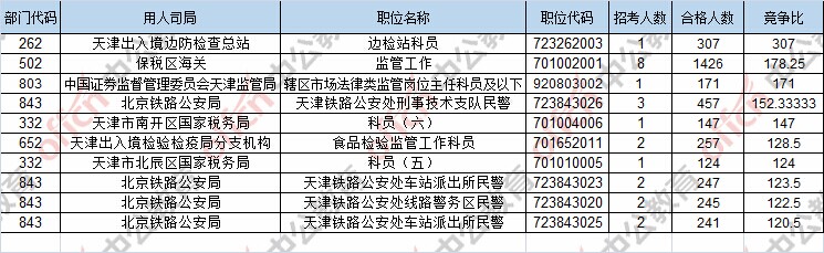 報名通過審核人數前十的職位主要集中在保稅區海關、北京鐵路公安局、天津出入境邊防檢查總站,具體信息如下: