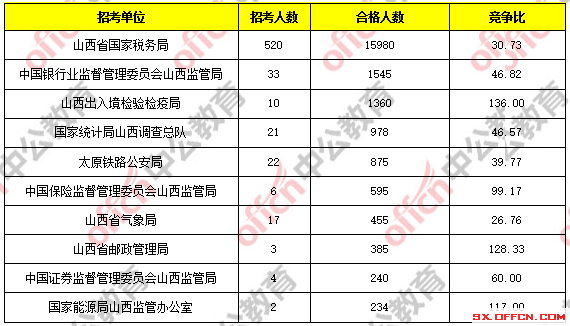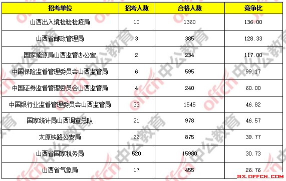為幫助廣大考生更清晰的了解今日報名情況,山西中公網校整理了合格人數前十位的部門以及競爭比例最激烈的十大部門,供廣大考生參考: