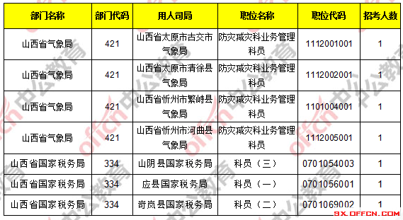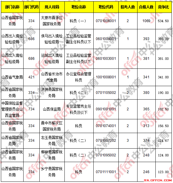 報考人數前十的職位主要集中在山西省國家稅務局、山西出入境檢驗檢疫局這兩個部門,具體信息如下: