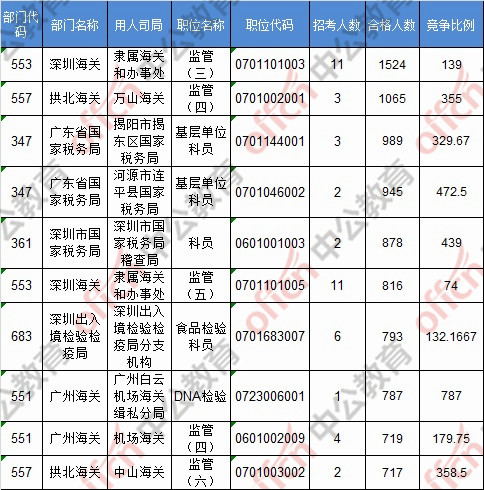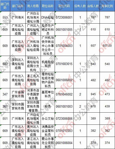截止到23日16時,競爭比例的職位為廣州海關廣州白云機場海關緝私分局DNA檢驗一職,招錄1人,截止到23日16時通過人數為787人。