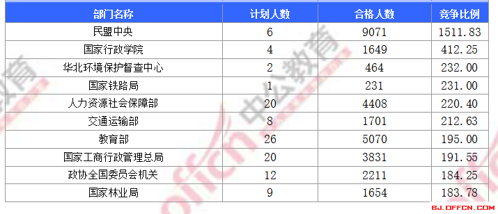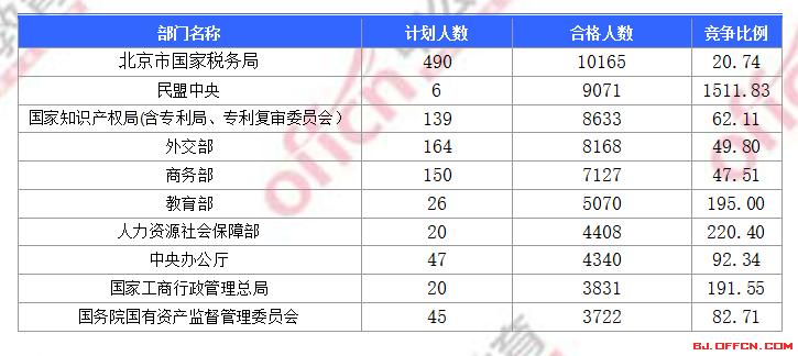 為幫助廣大考生更清晰的了解今日報名情況,北京中公網(wǎng)校整理了合格人數(shù)前十位的部門以及競爭比例最激烈的十大部門,供廣大考生參考: