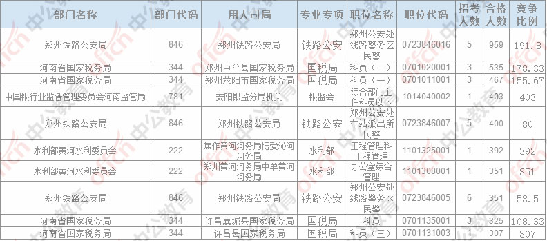 報(bào)名通過審核人數(shù)排名前列的職位主要集中在鄭州鐵路公安局、鄭州中牟縣國(guó)家稅務(wù)局,鄭州滎陽市國(guó)家稅務(wù)局,具體信息如下: