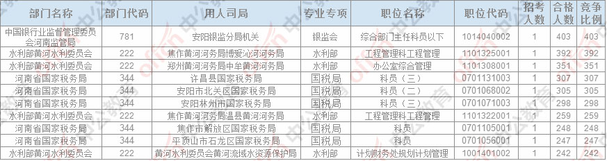 截止23日16時(shí),招錄比例的職位為中公銀行業(yè)監(jiān)督管理委員會(huì)河南監(jiān)管局安陽銀監(jiān)分局機(jī)關(guān)綜合部門主任科員以下一職,招錄1人,截止23日16時(shí)通過人數(shù)為403人。
