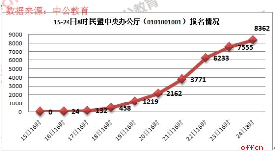 2017國考已進(jìn)入尾聲,民盟中央辦公廳接待處主任科員及以下(職位代碼為101001001)一職在19日摘得“雙冠”之后,以難以抵擋的“誘惑”,吸引這眾多考生的“蜂擁而至”,穩(wěn)居“人氣”的“頭把交椅”。截止到24日8時,該職位報(bào)名合格人數(shù)已增至8362人,報(bào)名人數(shù)如此之多,令人咂舌,雖然錄取的幾率渺茫,但絲毫擋不住社會人員對此職位的“向往”,中公教育專家預(yù)計(jì),在報(bào)名最后一天中,此職位報(bào)考人數(shù)的數(shù)值絕不會停滯,而是會“勇往直前”,或可出現(xiàn)“井噴”。