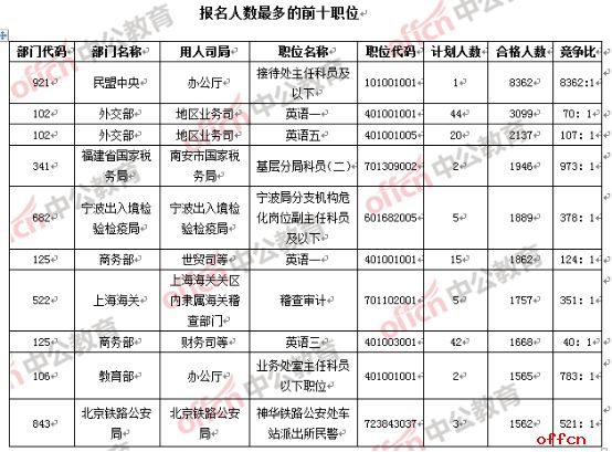 從報(bào)考人數(shù)上來看,截止24日8時,34個職位已經(jīng)“破千”,其中,3個職位的報(bào)名人數(shù)已經(jīng)2000千,而外交部地區(qū)業(yè)務(wù)司英語一(職位代碼401001001)一職成為今年第二個了3000大關(guān)的職位;從競爭比上來說,除民盟中央辦公廳接待處主任科員及以下(職位代碼為101001001)一職位于難以企及的“八千挑一”的高峰之外,另外,還有8個職位是“千里挑一”的職位,這與去年同期相比,前十個職位競爭比都在1107:1之上相較,今年報(bào)考“冷熱兩重天”的特點(diǎn)異常顯著,中公教育專家提醒考生,在選擇職位準(zhǔn)備“下手”時,一定要保持頭腦清醒,切勿盲目跟風(fēng)。