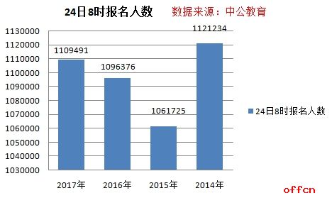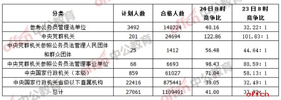 10月24日,2017國家公務員考試報名進入了最后一天,據中公網校數據統計,截至24日8時,經過了近9天又1夜的報名后,報名系統已經審核通過了1109491人,略高于去年同期的109萬,較昨天下午16時的數據相比,報名合格人數增加了8萬余人,平均競爭比為41:1。民盟中央辦公廳接待處主任科員及以下(101001001)這一職位目前競爭比已經高達8362:1,與其熱度相反的是,截至24日8時,仍有323個崗位報考人數還未破零,約占2%。中央黨群機關參照公務員法管理人民團體和群眾團體系統、中央黨群機關參照公務員法管理事業單位這兩個系統的所有職位已經全部有人過審,報考率達100%。