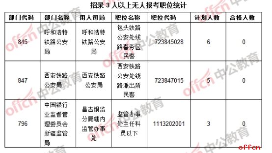 截至24日8時,仍有323個崗位報考人數還未破零,約占2%,比去年同期多出104個職位,值得注意的是中央黨群機關和中央國家行政機關(本級)均有掛零職位,分別為中共中央對外聯絡部二局蒙古語翻譯(職位代碼102004002)和國家外國專家局經濟技術專家司項目處主任科員及以下(職位代碼407002001),迄今為止仍無考生問津。“遇冷”職位大多分布于艱苦邊遠地區,尤其是一線職位,今日18時報名將截至,希望還有意參加本次國考的考生能考慮這些“遇冷”職位。