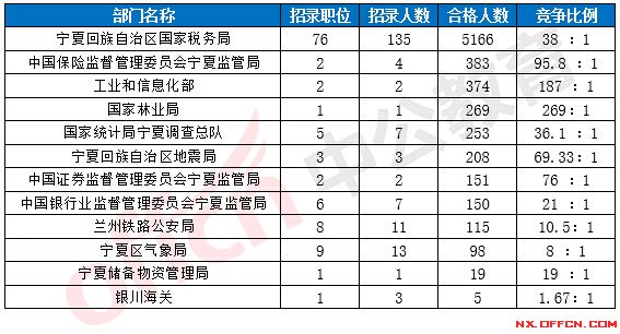 截至24日8時,據寧夏中公網校統計,2017國考招錄職位中工作地點在寧夏的職位審核合格總人數為7191人,所有職位均有人報考,其中4職位競爭比低于面試比例,平均競爭比例為43.92:1 。