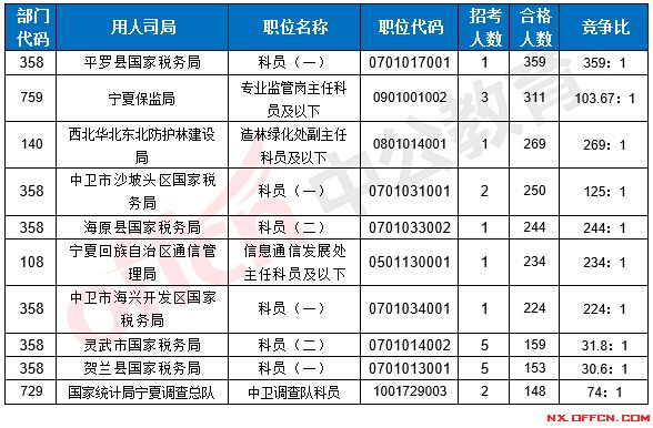 合格人數前十的職位主要集中在寧夏回族自治區國家稅務局、中國保險監督管理委員會寧夏監管局、國家林業局等部門,具體信息如下:
