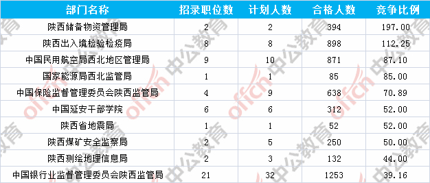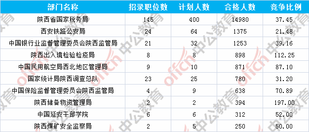 為幫助廣大考生更清晰的了解今日報名情況,陜西中公網校整理了審核通過人數前十位的部門以及競爭比例最激烈的十大部門,供廣大考生參考: