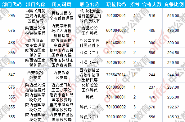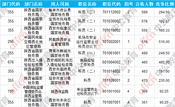 報名通過審核人數前十的職位主要集中在陜西出入境檢驗檢疫局、陜西省國家稅務局、中國民用航空局西北地區管理局等部門,具體信息如下: