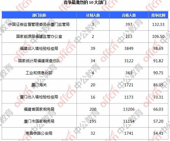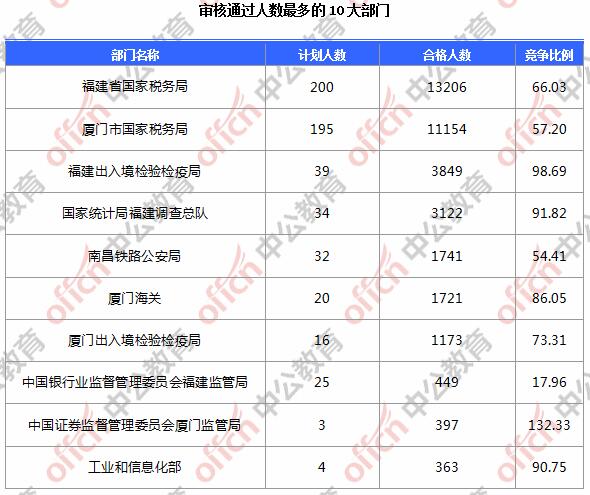 為幫助廣大考生更清晰的了解今日報名情況,福建中公網校整理了審核通過人數前10位的部門以及競爭比例最激烈的10大部門,供廣大考生參考: