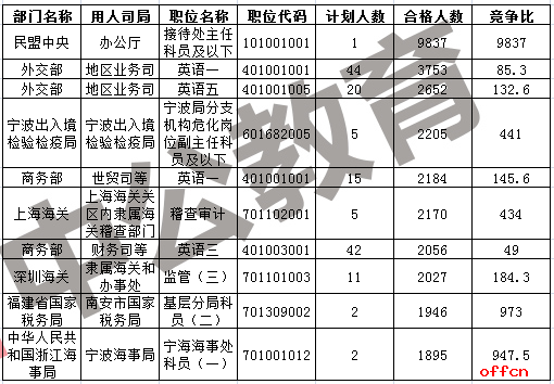從中公網校統計數據來看,2017國考報名人數最多的職位仍然為民盟中央辦公廳接待處主任科員及以下(職位代碼為101001001),緊隨其后的是兩個外交部職位,分別為外交部地區業務司英語一(職位代碼為401001001)和外交部地區業務司英語五(職位代碼401001005),招錄職位44人、20人,合格人數3753、2652人,競爭比分別為85.3:1,132.6:1。