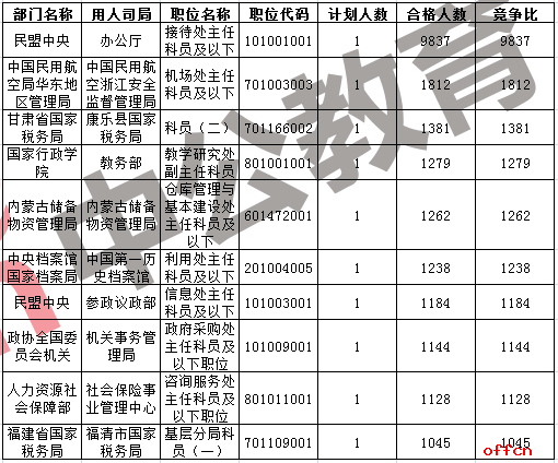 2017國家公務員考試報名階段已于24日18時落下帷幕,截止24日17時30分,共計1338698人通過審核,競爭比49.5:1,仍有223個職位無人報考。經過10天的報名,民盟中央辦公廳接待處主任科員及以下(職位代碼為101001001),當仁不讓的成為了2017國考最難考的職位,競爭比高達9837:1,這一比例也超越了2013年度國考“國家統計局重慶調查總隊國家統計局重慶調查總隊國家統計局南川調查隊業務科室科員”職位保持4年的競爭比的記錄,9837:1這個“可怕”的數字也將載入國考歷史,該職位也成為史上國考最難考取職位,相信這一記錄在未來幾年很難被打破,同時也看到了國考作為大考的地位仍然牢不可破。