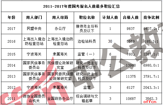 縱觀2011-2017國考報考情況,民盟中央職位確實非常特殊,以往報名人數最多的職位招錄人數都大于1人,招錄人數最多的是2016國考的上海出入境邊防檢查總站上海出入境邊防檢查總站邊檢站科員職位,招錄人數為30人,報考人數為5559,競爭比為185.3:1,雖然相比其他職位競爭比不高,但是185人爭一職也是相當殘酷的。
