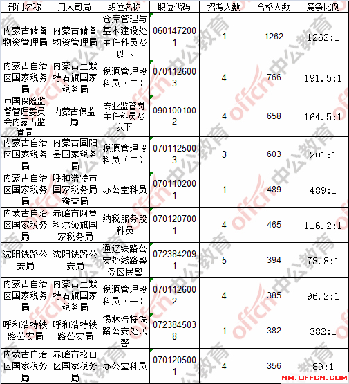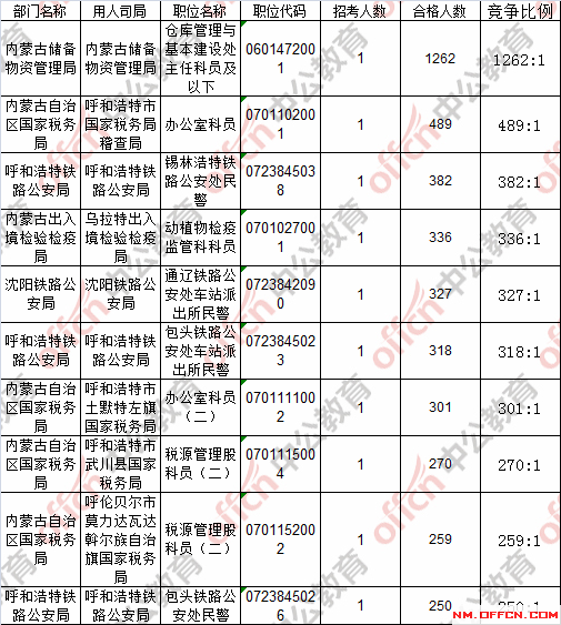 報(bào)名通過審核人數(shù)前十的職位主要集中在內(nèi)蒙古儲(chǔ)備物資管理局、內(nèi)蒙古土默特右旗國(guó)家稅務(wù)局、內(nèi)蒙古固陽(yáng)縣國(guó)家稅務(wù)局等部門,具體信息如下: