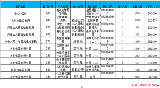 報名通過審核人數前十的職位主要集中在北京鐵路公安局、河北省國家稅務局、中央辦公廳等部門,具體信息如下: