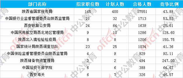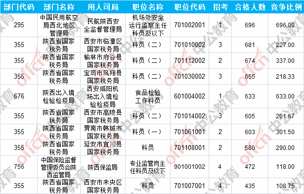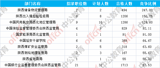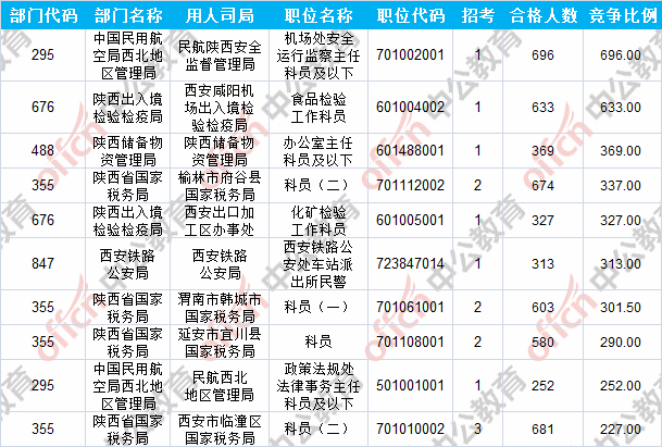報(bào)名通過(guò)審核人數(shù)前十的職位主要集中在中國(guó)民用航空局西北地區(qū)管理局、陜西省國(guó)家稅務(wù)局、陜西出入境檢驗(yàn)檢疫局等部門(mén),具體信息如下: