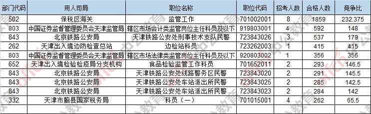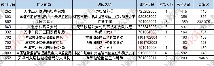 報名通過審核人數前十的職位主要集中在保稅區海關、中國證券監督管理委員會天津監管局、北京鐵路公安局,具體信息如下: