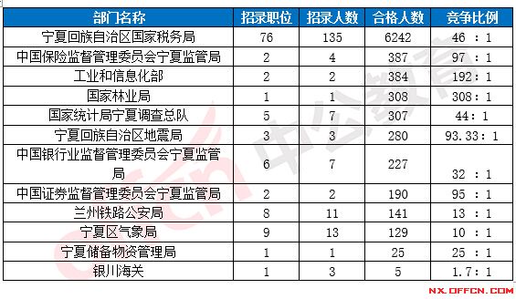 合格人數(shù)前十的職位主要集中在寧夏回族自治區(qū)國家稅務(wù)局、工業(yè)和信息化部、國家林業(yè)局等部門,具體信息如下: