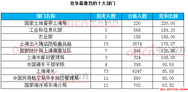 為幫助廣大考生更清晰的了解今日報名情況,上海中公網校整理了審核通過人數前十位的部門以及競爭比例最激烈的十大部門,供廣大考生參考: