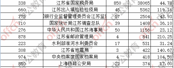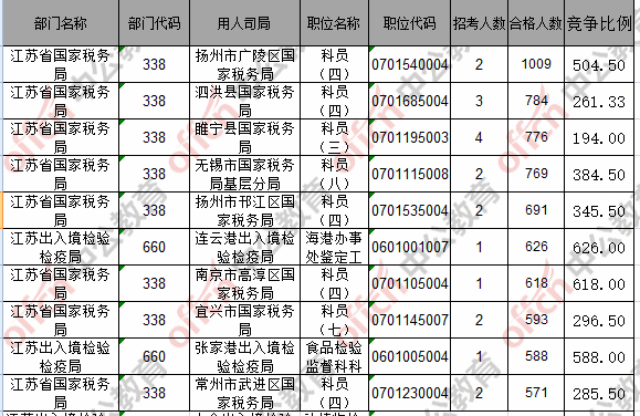報名通過審核人數前十的職位主要集中在江蘇省國家稅務局、江蘇出入境檢驗檢疫局,具體信息如下: