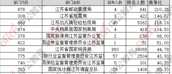 為幫助廣大考生更清晰的了解今日報名情況,江蘇中公網校整理了審核通過人數前十位的部門以及競爭比例最激烈的十大部門,供廣大考生參考: