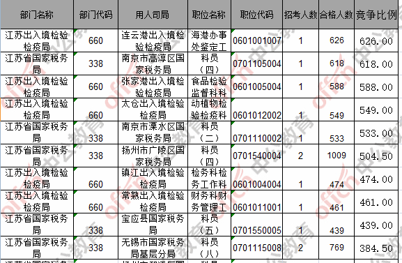 截至24日17:30時,競爭比例的職位為江蘇出入境檢驗檢疫局連云港出入境檢驗檢疫局海港辦事處鑒定工作科員一職,招錄1人,截至24日17:30時通過人數為626人。