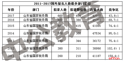從2011國考至今的報考情況來看,山東國稅局一直問鼎國考,連續7年奪得國家公務員考試報考人數最多的部門,首先這與其招考人數較多有一定關系,同時山東的地理環境優勢以及接受的教育都有一定關系。