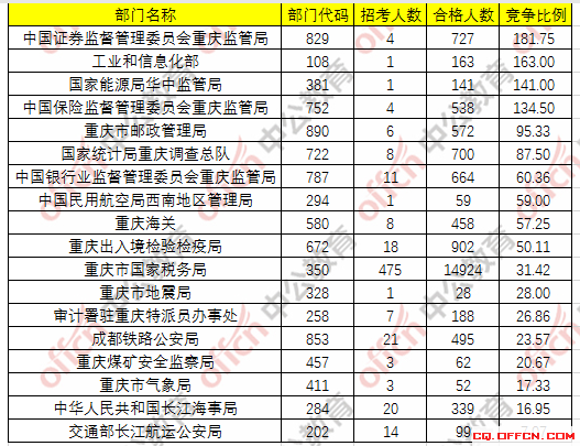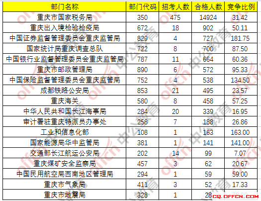 為幫助廣大考生更清晰的了解今日報名情況,重慶中公網校整理了重慶各個部門合格人數以及競爭比例,供廣大考生參考: