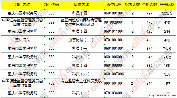 合格人數前十的職位主要集中在重慶市國家稅務局、重慶海關、中國證券監督管理委員會重慶監管局等部門,具體信息如下: