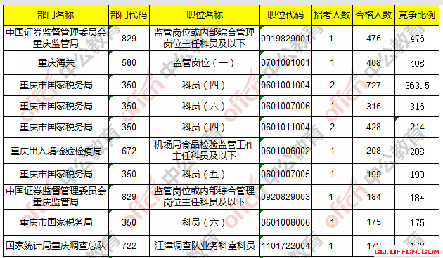 截止到24日17時30分,競爭比例的職位為中國證券監督管理委員會重慶監管局監管崗位或內部綜合管理崗位主任科員及以下一職,招錄1人,截止到24日18時合格人數為476人,競爭比例高達476:1。