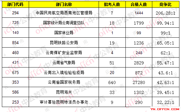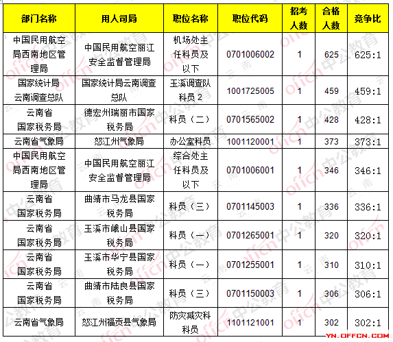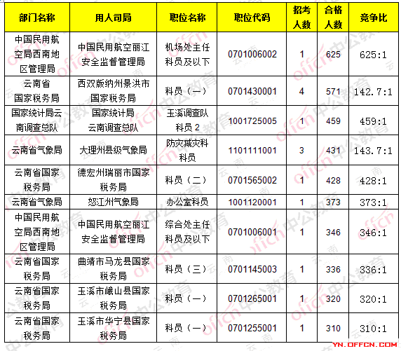 報(bào)名通過(guò)審核人數(shù)前十的職位主要集中在中國(guó)民用航空局西南地區(qū)管理局、云南省國(guó)家稅務(wù)局、國(guó)家統(tǒng)計(jì)局云南調(diào)查總隊(duì)等部門,具體信息如下: